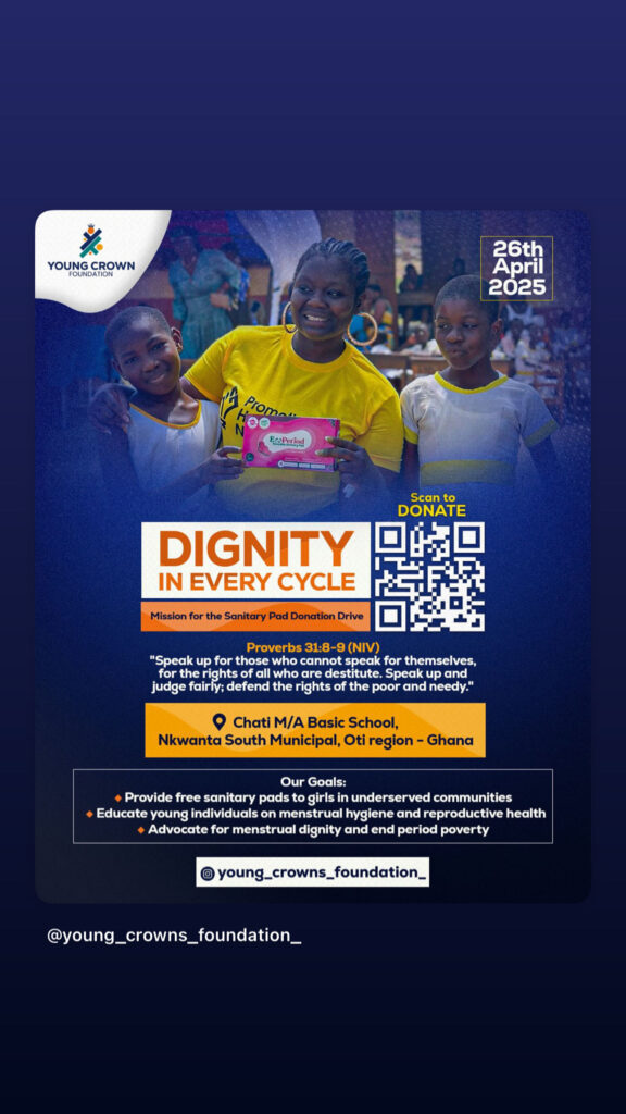 Young Crown Foundation focuses on early intervention, confidence building, and access to opportunity. Its work spans education, mental health, mentorship, and menstrual hygiene advocacy, with a strong emphasis on dignity and inclusion. For Angela, menstrual health is a leadership issue and a human rights issue. She has led initiatives addressing menstrual poverty in Ghana and the United Kingdom, grounding this work in education, sustainability, and community partnership.